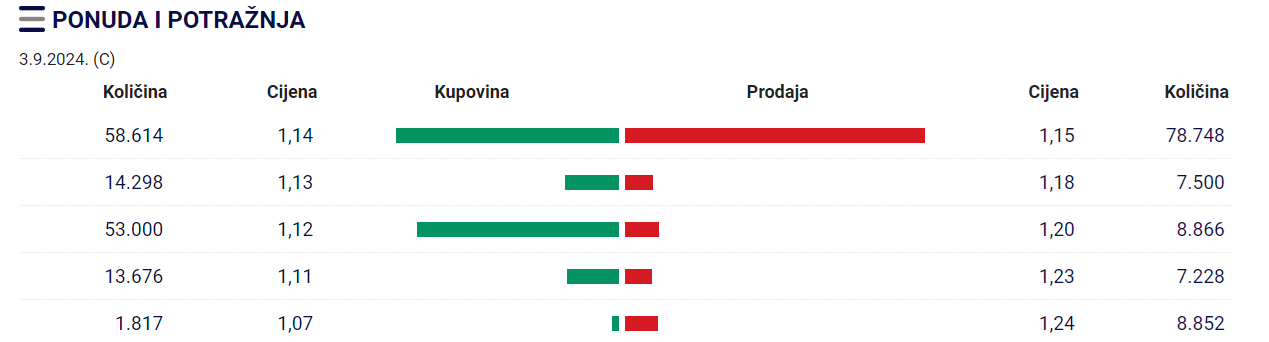 Pregled ponude i tražnje na tržištu akcija Mtela a.d. Banjaluka, 3.9.2024.
